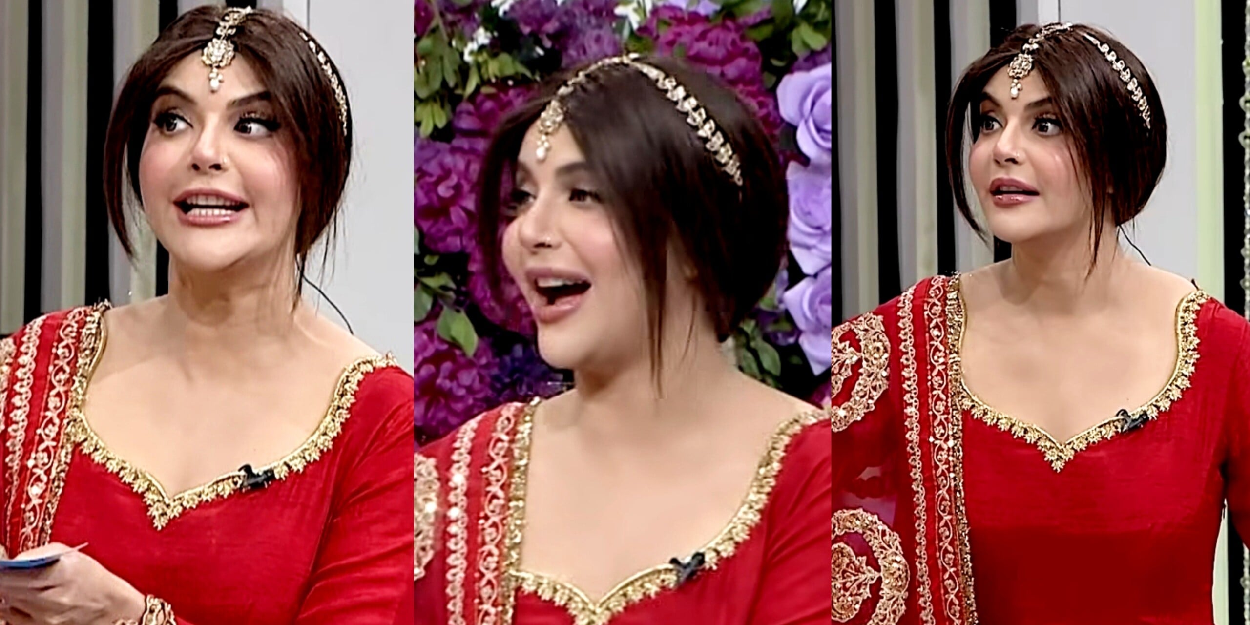 عید پروگرام کے دوران ندا یاسر نے سرخ رنگ کا ریشمی لباس زیب تن کیا