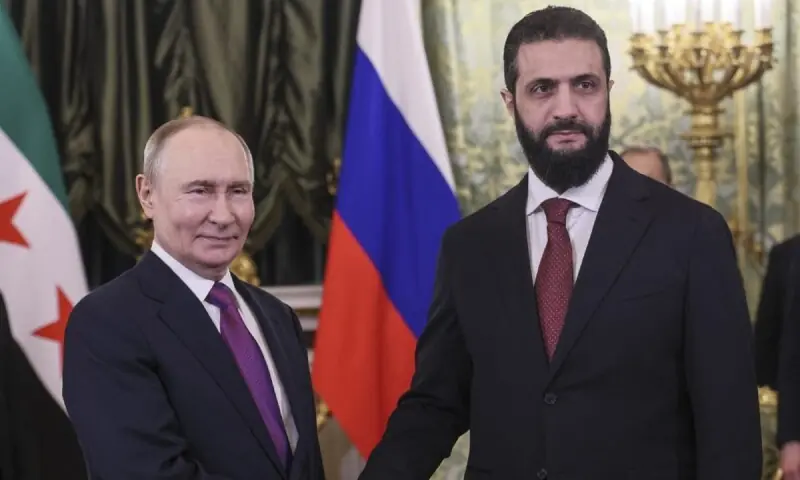ملاقات سے قبل مشترکہ نیوز کانفرنس سے خطاب کرتے ہوئے شامی صدر احمد الشرع نے شام میں اتحاد اور استحکام کی حمایت پر صدر پیوٹن کا شکریہ ادا کیا۔
