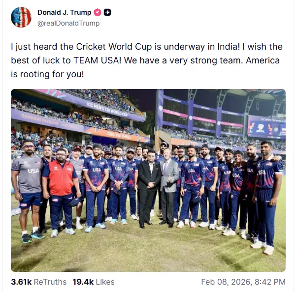 امریکی صدر ڈونلڈ ٹرمپ نے آئی سی سی مینز ٹی ٹوئنٹی ورلڈ کپ 2026 میں شامل امریکا کی ٹیم کے لیے نیک تمناؤں کا اظہار کیا ہے۔