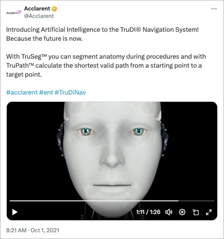 رائٹرز کے مطابق جونسن اینڈ جونسن کی ذیلی کمپنی ’ایکلیرینٹ‘ نے 2021 میں اپنی ٹرو-ڈی نیوی گیشن سسٹم میں اے آئی شامل کرنے کا اعلان کیا تھا۔ یہ آلہ کان، ناک اور گلے کے جراحی کے دوران سرجنز کی رہنمائی کے لیے استعمال ہوتا ہے۔