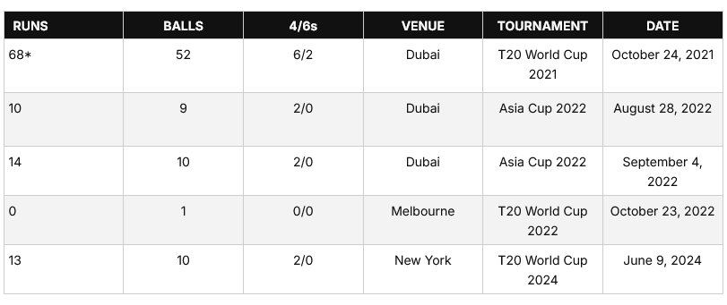 بابر اعظم اب تک بھارت کے خلاف پانچ ٹی 20 انٹرنیشنل میچ کھیل چکے ہیں، جن میں ایک نصف سنچری کی مدد سے انہوں نے مجموعی طور پر 105 رنز بنائے ہیں۔
