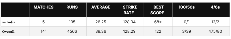 مجموعی طور پر بابر اعظم 141 ٹی 20 انٹرنیشنل میچز میں 4566 رنز بنا چکے ہیں اور بھارت کے خلاف آئندہ میچ میں ان کی بیٹنگ کارکردگی ایک بار پھر توجہ کا مرکز ہوگی۔