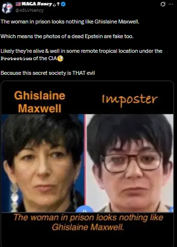 ایک پوسٹ میں صارف نے کہا کہ جیل میں نظر آنے والی خاتون قیدی گیسلین میکس ویل نہیں ہے جس کا مطلب ہے کہ ایپسٹین بھی زندہ ہے اور یہ لوگ امریکی خفیہ اجنسی سی آئی اے کی پناہ میں ہیں۔