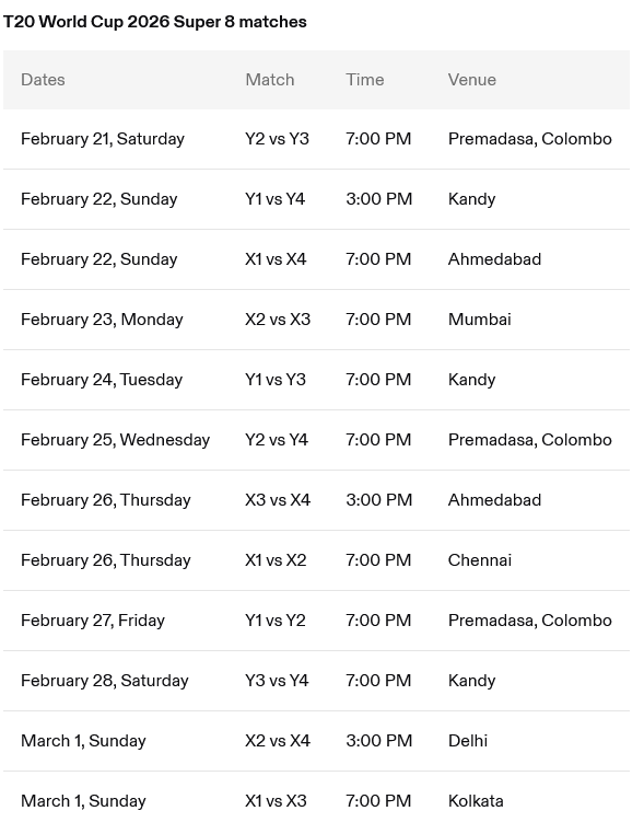 سپر 8 مرحلے کے میچز 21 فروری سے یکم مارچ تک کھیلے جائیں گے، جن میں کولمبو، کینڈی، احمد آباد، ممبئی، چنئی، دہلی اور کولکتہ میں مقابلے شیڈول ہیں۔