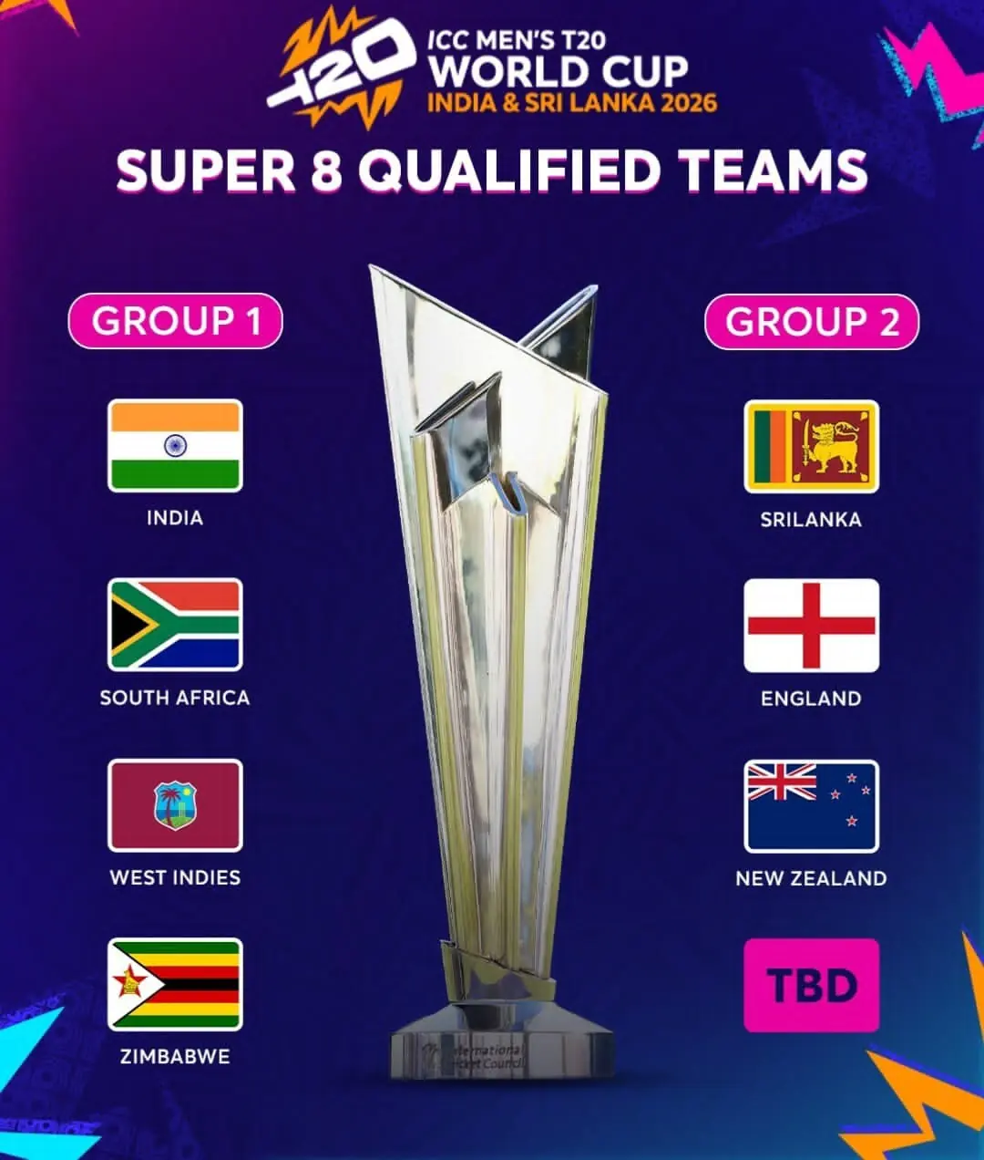 آئی سی سی مینز ٹی 20 ورلڈ کپ 2026 کے سپر ایٹ مرحلے میں اب تک 7 ٹیموں نے کوالیفائی کرلیا ہے جب کہ ایک ٹیم کا فیصلہ ہونا باقی ہے۔