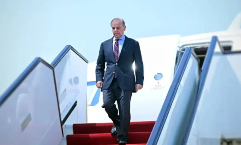 وزیرِاعظم کے ہمراہ نائب وزیرِاعظم و وزیرِ خارجہ اسحاق ڈار، وزیرِ خزانہ محمد اورنگزیب، وزیرِ اطلاعات عطاء تارڑ اور معاونِ خصوصی طارق فاطمی بھی وفد میں شامل ہیں۔