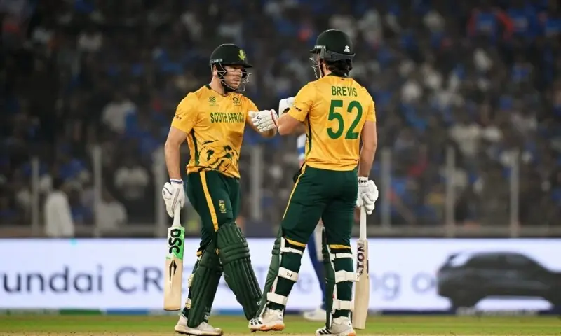 جنوبی افریقا کی کی ابتدائی تین وکٹیں 20 کے اسکور پر گر گئی تھیں جس کے بعد ڈیوالڈ بریوس اور ڈیوڈ ملر نے ٹیم کو سہارا دیا۔
