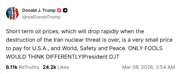 امریکی صدر ڈونلڈ ٹرمپ نے اپنے سوشل میڈیا پلیٹ فارم ٹروتھ سوشل پر بیان میں کہا کہ تیل کی قیمتوں میں اضافہ عارضی ہے اور یہ عالمی امن کے بدلے کوئی بڑی قیمت نہیں ہے۔ ایران کے جوہری خطرے کے خاتمے کے بعد یہ قیمتیں تیزی سے کم ہو جائیں گی۔