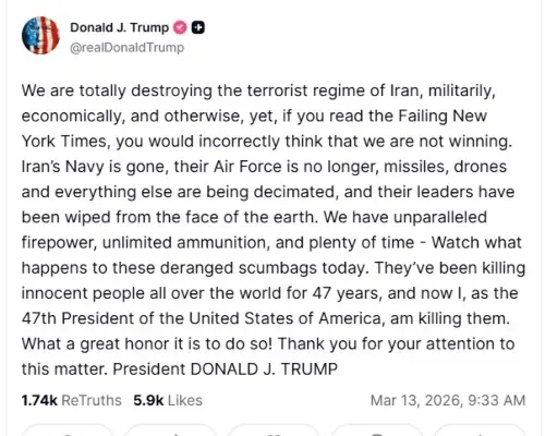 ڈونلڈ ٹرمپ کا کہنا ہے کہ امریکی کارروائیوں کے نتیجے میں ایران کی بحری اور فضائی افواج تقریباً ختم ہو چکی ہیں جبکہ میزائل اور ڈرون بھی مسلسل تباہ کیے جا رہے ہیں۔