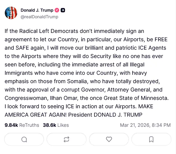 ہفتے کو اپنے سوشل میڈیا پلیٹ فارم سوشل ٹروتھ پرجاری بیان میں امریکی صدر ڈونلڈ ٹرمپ نے خبر دار کیا کہ اگر ڈیموکریٹس نے بجٹ معاہدہ نہ کیا تو وہ امیگریشن اینڈ کسٹمز انفورسمنٹ (آئی سی ای) اہلکار ایئرپورٹس پر تعینات کیے جائیں گے، جو غیر قانونی تارکین وطن کو فوری طور پر گرفتار کریں گے۔