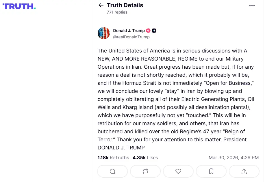 تاہم امریکی صدر نے سخت انتباہ دیتے ہوئے کہا کہ اگر کسی وجہ سے معاہدہ نہ ہو سکا اور آبنائے ہرمز کو فوری طور پر نہ کھولا گیا تو امریکا ایران کی اہم توانائی تنصیبات کو نشانہ بنائے گا۔ ان میں بجلی گھر، تیل کے کنویں، جزیرہ خارگ اور دیگر اہم انفراسٹرکچر شامل ہو سکتے ہیں۔