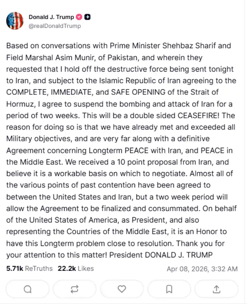 صدر ٹرمپ نے اپنے سوشل میڈیا پلیٹ فارم ’ٹروتھ سوشل‘ پر جاری پوسٹ میں تصدیق کی کہ وہ ایران کے بجلی گھروں اور پلوں سمیت دیگر بنیادی ڈھانچے پر ہونے والے ممکنہ حملوں کو روک رہے ہیں، تاہم اس کے بدلے ایران کو آبنائے ہرمز کو فوری اور مکمل طور پر بحری ٹریفک کے لیے کھولنا ہوگا۔