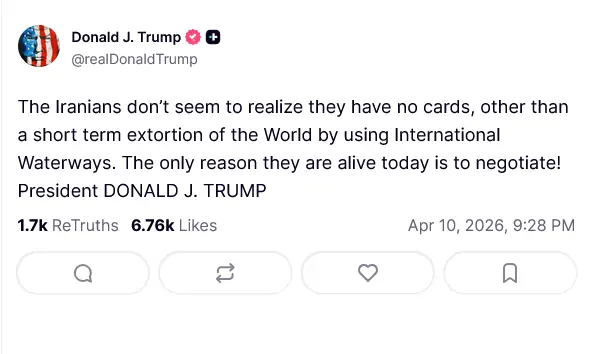 امریکا اور ایران کے درمیان ممکنہ بات چیت سے چند گھنٹے قبل امریکی صدر ڈونلڈ ٹرمپ نے ایران کے خلاف سخت بیان دیتے ہوئے ایک بار پھر دھمکی دی ہے کہ ایرانیوں کو سمجھ نہیں آرہا ان کے پاس اب کوئی کارڈز نہیں، آبنائے ہرمز وقتی طور پر بند کرکے بھتہ لینے کے علاوہ کوئی کارڈ نہیں، ایرانی صرف زندہ اس لیے ہیں کہ وہ ٹرمپ سے بات کررہے ہیں۔
