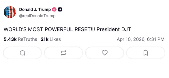 امریکی صدر ڈونلڈ ٹرمپ نے معاملات کی تبدیلی کا اشارہ دیتے ہوئے سوشل میڈیا پوسٹ پر لکھا کہ دنیا کا سب سے طاقتور ری سیٹ ہوگیا۔ بظاہر اس پوسٹ میں کوئی مزید حوالہ نہیں ہے لیکن امریکی میڈیا نے اس پر کہا ہے کہ صدر ٹرمپ کے یہ جملے ایران سے مذاکرات کے حوالے سے ہیں۔