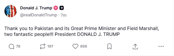 امریکی صدر ڈونلڈ ٹرمپ نے کہا ہے کہ آج دنیا کے لیے ایک عظیم دن ہے۔ انہوں نے امریکا اور ایران کے درمیان ثالثی میں مرکزی کردار ادا کرنے پر پاکستان کے وزیراعظم شہبازشریف اور فیلڈ مارشل سید عاصم منیر کو ’دو لاجواب شخصیات‘ کہہ کر مخاطب کیا اور دونوں کا شکریہ ادا کیا۔