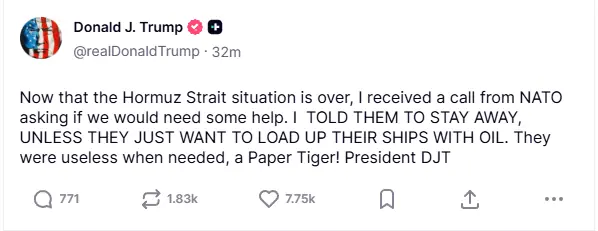 صدر ٹرمپ نے دعویٰ کیا کہ آبنائے ہرمز کا مسئلہ حل ہونے کے بعد نیٹو نے ان سے رابطہ کر کے مدد کی پیشکش کی جسے انہوں نے سختی سے مسترد کر دیا ہے۔