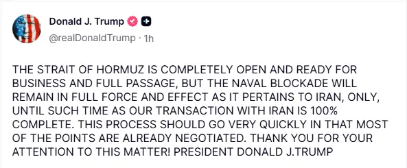 ایران کی جانب سے آبنائے ہرمز کھولے جانے کے اعلان کے فوراً بعد امریکی صدر ڈونلڈ ٹرمپ نے یکے بعد دیگرے کئی بیانات جاری کیے ہیں۔ ان بیانات میں صدر ٹرمپ نے پاکستانی وزیراعظم شہبازشریف اور فیلڈ مارشل عاصم منیر کا شکریہ ادا کیا ہے۔ اس کے علاوہ انہوں نے خلیجی ممالک کی تعریف کی، نیٹو پر شدید تنقید اور اسرائیل کو خبردار کیا کہ وہ لبنان پر حملوں سے باز رہے۔ ایک بیان میں انہوں نے ایران کی ناکہ بندی جاری رکھنے کا بھی اعلان کیا ہے۔