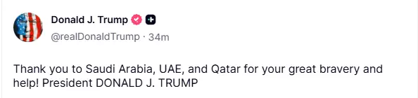 ایک اور مختصر پیغام میں امریکی صدر نے خلیجی ممالک کی تعریف کی۔ انہوں نے لکھا کہ سعودی عرب، متحدہ عرب امارات اور قطر کی زبردست بہادری اور مدد کا شکریہ‘۔